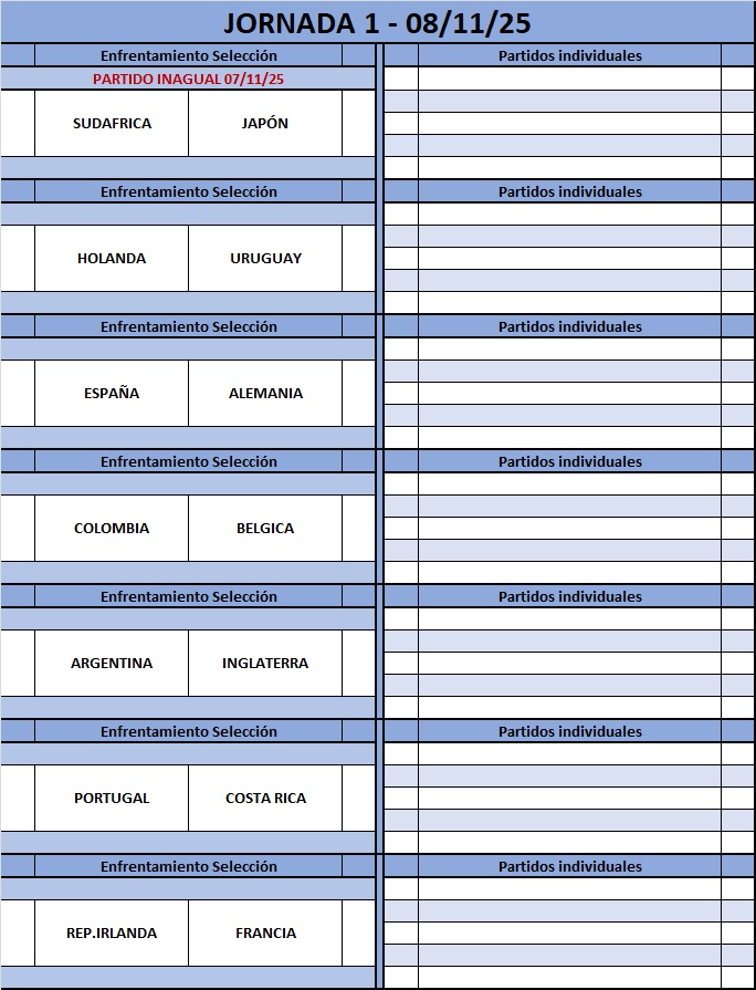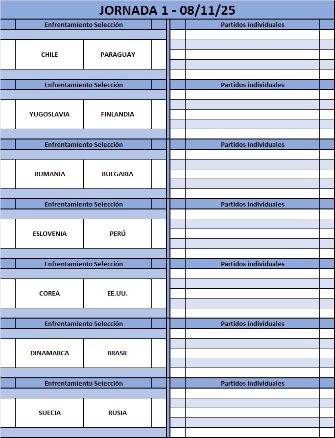 Equipos Inscritos: SUDÁFRICA ![]() Equipos Titulares: 1- Kaizer FC 2- R.Quimeras 3- TAZZX 4- Coca Jrs. 5- Los Mochil Equipos Suplentes: 6- 7- Seleccionador: Kaizer FC ARGENTINA ![]() Equipos Titulares: 1- Narón Utd. 2- Real Munilla 3- FC.Petrus 4- DeoortivoHur 5- TeamAndoni Equipos Suplentes: 6- Atl. Tradis 7- GusanosButia Seleccionador: Atl. Tradis/FC.Petrus BULGARIA ![]() 1- SASIJAINKO 2- MANJULA 3- Aloha 4- Ochate CF 5- Zipo 10 Equipos Suplentes: 6- Girona F.C 7- Vigo PalaceSeleccionador : Vigo Palace HOLANDA ![]() Equipos Titulares: 1- Volendam FC 2- Errantes F.C 3- Jambos Locos 4- Ath. Laguna 5- CD Dimoni Equipos Suplentes: 6- C.D. Aragon 7- Lebowsky FC Seleccionador : Los Kevins/maikelfc COSTA RICA ![]() Equipos Titulares: 1- Stralis FC 2- Ciudad Sur 3- ikeryna 4- C.D. Lugo 5- los peques Equipos Suplentes: 6- Eresma C.F 7- The KiesSeleccionador: ikeryna/Eresma C.F IRLANDA ![]() 1- Hospitalet 2- Rara Avis 3- Velez 4- JORDIER 5- FC MAXIM05 Equipos Suplentes: 6- SHOHOKU 7- F.C.B.FISH Seleccionador: Galvan XIII DINAMARCA ![]() Equipos Titulares: 1- Billabona 2- MondegueroFC 3- VamosLega 4- Floren Team 5- Normandos Equipos Suplentes: 6- Kamchatka 7- Ribe Utd Seleccionador : Ribe Utd PARAGUAY ![]() Equipos Titulares: 1- Dep. Cigota 2- Inde FC 3- iguasitges 4- Barderos FC 5- C.D. Tenerife Equipos suplentes: 6- Diplo F.C 7- VodkaLimonSeleccionador: VodkaLimon INGLATERRA ![]() Equipos Titulares: 1- CF Se queda 2- Inter Alcala 3- Pakete.f.c 4- shaqisback 5- munster Equipos Suplentes: 6- Huesconsin 7- The boss Seleccionador : CF Se queda RUMANIA Equipos Titulares: 1- SD Burela 2- Whiteam 3- CHEEKS 4- Xomi 5- Los Boliches Equipos Suplentes: 6- 7- Seleccionador: Los Boliches COREA ![]() Equipos Titulares: 1- Meristem U 2- Parleste FC 3- La elite 4- jionde 5- New Pdrajs Equipos Suplentes: 6- Bayonja FC 7- Pto Sagunto Seleccionador : Pto Sagunto URUGUAY ![]() Equipos Titulares: 1- URUGUAYOS FC 2- Meque 3- balmes.c.f 4- Piratas 5- CD EL RUBIO Equipos Suplentes: 6- Sabadell F.C 7- Wataru CF Seleccionador: balmes.c.f SUECIA ![]() Equipos Titulares: 1- Raudex 2- Laboure CF 3- Águilas 4- EL PUERTO 5- CSKargos Equipos Suplentes: 6- SD Brion 7- The CannibalSeleccionador: The Cannibal/SD Brion RUSIA ![]() Equipos Titulares: 1- kanpest 2- Rointe UD 3- F.C.Sharkers 4- NakedCity 5- The Tenors Equipos Suplentes: 6- Almodovar CF 7- Seleccionador : Almodovar CF BÉLGICA ![]() Equipos Titulares: 1- Squirrel F.C 2- C.E. Mataro 3- TINTIN 4- Joint Boys 5- Cuellar Equipos Suplentes: 6- Rosario Ar 7- Batet Seleccionador: Joint Boys/ZOZO Dj BRASIL ![]() Equipos Titulares: 1- TrainingTime 2- ARCANGEL 3- CF NouBarris 4- La Eternidad 5- C.F.Masaos Equipos Suplentes: 6- PCaio 7- UDFurtePeras Seleccionador: UDFurtaPeras JAPÓN ![]() Equipos Titulares: 1- Montoya Ut 2- F.C. MONCHO 3- Risitas CF 4- tetoteam 5- DRAGONBOL Equipos Suplentes: 6- Residuales 7- Jager United Seleccionador : Risitas CF ESPAÑA ![]() Equipos Titulares: 1- 4VKS 2- mesqunclub 3- Ansalus C.D. 4- Jabberwocky 5- SrMortred Equipos Suplentes: 6- Gran Canaria 7- Talavera CF Seleccionador : mesqunclub COLOMBIA ![]() Equipos Titulares: 1- Lost2dRiver 2- Envigado 3- GuaCaMaYoS 4- Phoenix FC 5- Melilla FC Equipos Suplentes: 6- Astracan 7- Seleccionador: Lost2dRiver FRANCIA ![]() Equipos Titulares: 1- O Mapelli 2- añuroc al 3- buitres 4- UTOPIC 5- Puigvertenc Equipos Suplentes: 6- CP Monte 7- Box Lunch Seleccionador: Box Lunch PERÚ ![]() Equipos Titulares: 1- RCRH1889 2- RUMBERAS 3- Verdes fc 4- KANEKO 5- trivinet.com Equipos Suplentes: 6- Armrodgon 7- punta F.C. Seleccionador: ZARAGOZA YUGOSLAVIA ![]() Equipos Titulares: 1- Tifosi FC 2- skuirlys 2.0 3- MugiwaraTeam 4- Uchi-mata 5- At.Eivissenc Equipos Suplentes: 6- Berdica Fc 7- FERZA TEAM Seleccionador: CLAUSAN FC PORTUGAL ![]() Equipos Titulares: 1- San Anton 2- EgaraFc 3- Luismi F.C 4- InterStar 5- Humboldt FC Equipos Suplentes: 6- FC Algeciras 7- Werewolves Seleccionador: Base 2 | ||||||||||||||||||||||||||||