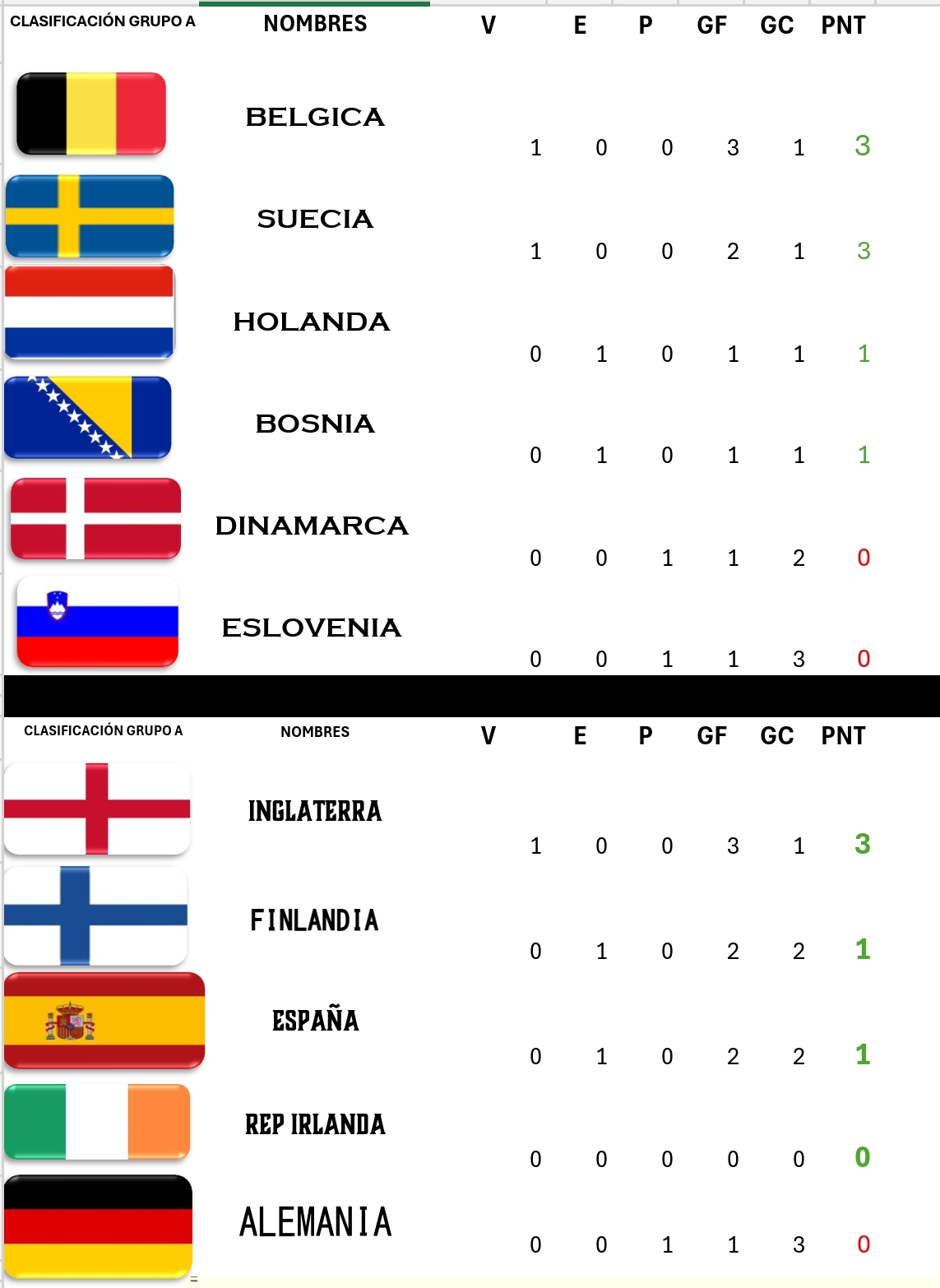 GRUPOS: GRUPO A: 1- Suecia 2- Dinamarca 3- Holanda: 4-Bosnia 5- Belgica 6- Eslovenia GRUPO B: 1-Finlandia 2- Alemania 3-España 4-Inglaterra 5- Rep Irlanda CLASIFICACION: