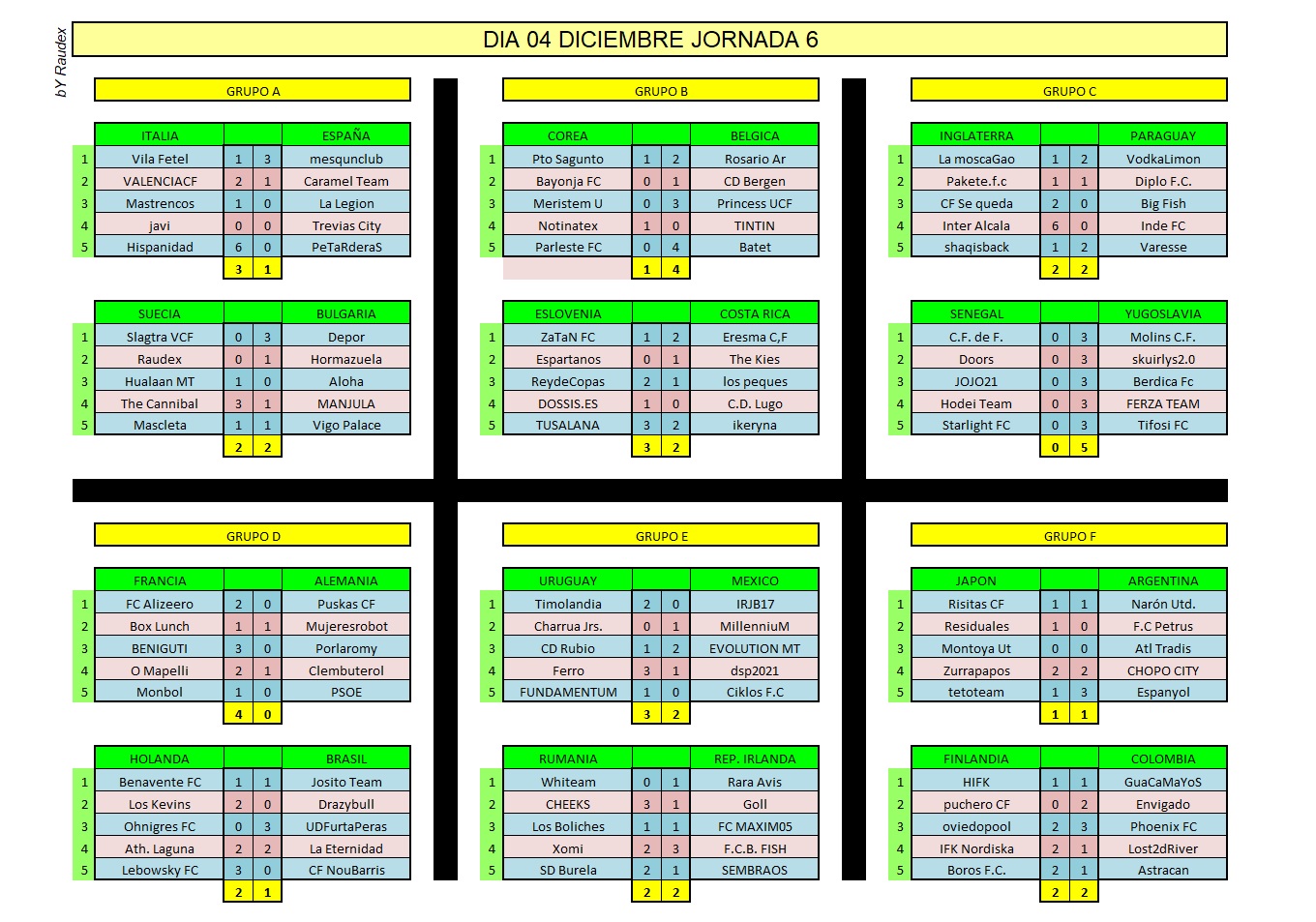 JORNADA 5 Tras el término de esta jornada tan sólo iba a quedar la decisiva jornada 6. Son muchas las selecciones que querían hoy cerrar su pase, para no pasar apuros de cara a la jornada final. Veremos la suerte de cada selección. GRUPO A Los partidos de hoy eran: Bulgaria - Italia Suecia - España Bulgaria - Italia 1-1 Las dos selecciones se jugaban su continuidad en esta copa, por lo que la victoria sería clave para el equipo que lograse llevársela. El partido comenzaba con claro dominio local. Los búlgaros querían salir del farolillo rojo y se pusieron raudo a buscar el partido. Las ocasiones no tardaron en llegar, por lo que la emoción era bastante alta. En el minuto 13 de partido el balón iba a llegar a un jugador que había ocupado el banquillo en las últimas jornadas, un jugador que quería demostrar su valía. Controló el esférico, lo dirigió hacia puerta y de un brutal chupinazo lo ponía en el fondo de las mallas. Hormazuela celebraba ese gol con rabia e ilusión, ya que le daba esperanzas a Bulgaria. El conjunto italiano, que pasaba a ocupar la última plaza del grupo, sacó rápidamente su furia y su amor por esos colores. Fueron sólo 4 minutos los que la alegría les iba a durar a Bulgaria, justo esos 4 minutos que tardaría javi en volver a poner tablas en el marcador. El partido parecía que podía volverse locos, con tantas idas y venidas, por lo que los jugadores prefirieron enfriar el partido un poco para poder cerrar el partido a su favor pero con cabeza. Llegaríamos así al descanso, esperando ver una segunda parte con un claro favorito que lograse inclinar la balanza a su favor. El resultado era todo lo contrario, ya que ambas selecciones temían perder líneas y dejar vendida su defensa. Alguna que otra ocasión pudimos contabilizar pero el partido estaba encaminado al resultado de "X". Tras los 90 minutos de juego, más el descuento, el reparto de puntos se hacía efectivo, un reparto de puntos que no sirve a nadie. Bulgaria queda matemáticamente eliminada de este mundial, mientras que Italia aún le puede quedar la más remota posibilidad, una posibilidad que pasaría por golear y esperar resultados ajenos. Suecia - España 3-2 Duelo de trenes por la lucha del liderato de este grupo. El ganador iba a copar la 1ª plaza. Los suecos querían ganar para además asegurar el primer puesto de grupo, sin necesidad de llegar a la última jornada. España quería ganar para mantener esa esperanza de gobernar este difícil grupo. El partido comenzaba sereno, con ambas selecciones mirándose la una a la otra, pero nadie quería mover ficha. Había 21 jugadores que parecía tener la lección aprendida, la de no perder la compostura y no dejar nada a la improvisación. Decimos 21 porque el jugador 22 es un depredador del gol, es un sanguinario balón, un salvaje de la meta contraria...como su propio nombre indica es "the canibal". Con el 1-0 Suecia se la veía muy contento hasta que España reaccionó. Rápidamente el capitán español puso las cosas en su sitio y volvía a poner la igualada en el electrónico. El gol fue celebrado con rabia, modo puyol style. Fue corriendo a celebrarlo a la banda, se arrancó el brazalete con la bandera de España y la besó. Unió a sus compañeros y dijo "señores, este equipo es mesqunclub" Con el 1-1 el partido entraba en una fase de éxtasis. Ambas selecciones querían llegar al descanso dominando el marcador. Suecia se había adelantado primero y ellos querían volver a hacerlo. España, por su parte, quería darle la vuelta al marcador y a la tabla del grupo A. El gol podía llegar por cualquier bando, pero el colegiado comenzaba a llevarse el silbato a la boca. El 1er tiempo estaba a punto de terminar. Antes de ello se produjo una falta en la frontal del área sueca. Sonaban tambores de guerra desde la grada española, era la última oportunidad antes del más que merecido descanso. Andalus C.D. respiraba, tomaba carrerilla y lanzaba el balón por encima de la barrera. El balón subía y cuando parecía que se iba a escapar por arriba del travesaño, caía de manera brutal hasta el fondo de las mallas. Acabábamos de ver la ejecución de una perfecta "folha seca" En el descanso se refrescaron las ideas. Ambos seleccionadores dieron las órdenes al detalle. La 2ª parte comenzaba y esas órdenes comenzaban a ser mejor ejecutadas por el lado local, el sueco. Las órdenes parecía que era la de dormir el balón y dejar a los españoles sin éste. Era una orden arriesgada, pues Suecia iba 1-2 por debajo en el marcador y además ocupaba la 2ª plaza. Lo único bueno es que el empate momentáneo en el otro partido del grupo hacía que Suecia estuviese clasificada, aún perdiendo. Los minutos pasaban y las ocasiones brillaban por su ausencia. Nos íbamos hasta el minuto 80 para ver el primer acercamiento de esta 2ª mitad. El balón llegaba a las inmediaciones de Hualaan MT, que recogía el esférico y ametrallaba al rival. Ese gol hacía respirar a Suecia, pues volvían a recuperar el liderato. Con España rota por ese empate Suecia seguía a la carga. España no atacaba, mientras que Suecia seguía rondando la frontal del área acercándose cada vez un poco más. En los minutos finales el balón iba a llegar a las botas de SD Brion. Este veterano sueco sacó sus galones y remató un gran centro con todas sus ansias. El balón terminaría dándole la victoria, y los 3 puntos, a los suyos. Suecia volvía a remontar un partido que tenía muy cuesta arriba, demostrando así que con paciencia y buen juego este mundial puede ser suyo. Suecia queda como 1ª de grupo España queda como 2ª, ambas selecciones ya clasificadas Italia necesita ganar su último partido y esperar a entrar entre las mejores 3ªs. La única posibilidad pasa por ganar en la jornada 6. Bulgaria queda eliminada esperando buscar su primera victoria. GRUPO A Los partidos de hoy eran: Costa Rica - Corea Eslovenia - Bélgica Costa Rica - Corea 4-1 Costa Rica ne