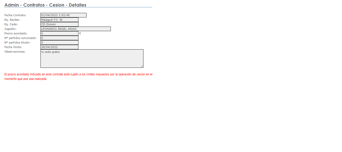 Hemos observado que el jugador no podía ser cedido al filial de Malaguti debido a su edad, las cesiones a filiales tiene un limite de edad de 24 años y el jugador en cuestión tiene 25 y tiene que acabar la temporada con menos de 26. Si no hay mas novedad cerramos caso.