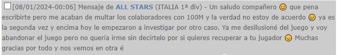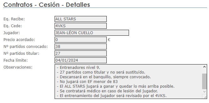 El equipo ALL STARS ha decidido abandonar el juego y por ello pido la devolución del jugador cedido JEAN-LÉON CUELLO