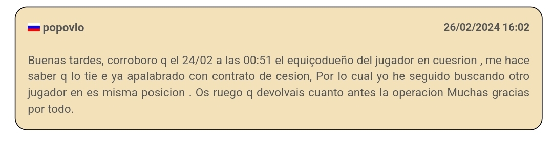 Soy el manager del Nomadas Tenía por contrato la cesión del jugador TSHEPO MOKABA al equipo Servían por contrato. El manager del equipo Popovlo me preguntó por comunicado por ese jugador hace dos días y le indiqué que ya estaba comprometido con otro manager por contrato. He avisado al manager del Servían que estaba cedible, y he recibido una petición de cesión , y por error he dado a aceptar sin darme cuenta que era de Popovlo en lugar de Servían. Solicito la devolución de la cesión y del dinero pagado, para pasárselo a Servian que es con quién tengo contrato. |