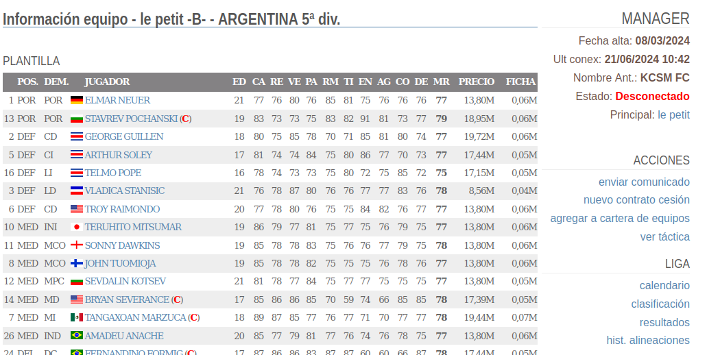 Buenas, cedí a Fernandino Formigao a le petit B de la 5ª argentina y no se conecta desde hace una semana. Aquí tenéis el jugador, el contrato y la captura en la que se ve que el manager no se conecta Saludos !! ![]() ![]() ![]() |