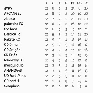 ARCANGEL:![]() Berdica Fc![]() SD Brion![]() Lebowsky FC![]() CD Kart H![]() Scorpions![]() Zipo 10![]() UDFurtaPeras![]() mesqunclub![]() The boss![]() AMANDA98![]() 4VKS![]() Pakete.f.c![]() CD Dimoni![]() C.D. Aragon![]() Palestina FC![]() Editado por Tordabool - 26/Agosto/2025 a las 19:37 |